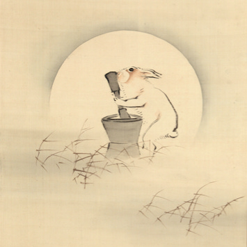 Once, a rabbit’s pure heart was rewarded by a place on the moon. In quiet lunar garden, it has since pounded herbs to elixirs, mortar and pestle in hand. Where the rabbit brews, musings rise: steeped in starlight, a lunar thread tied to earthly things.