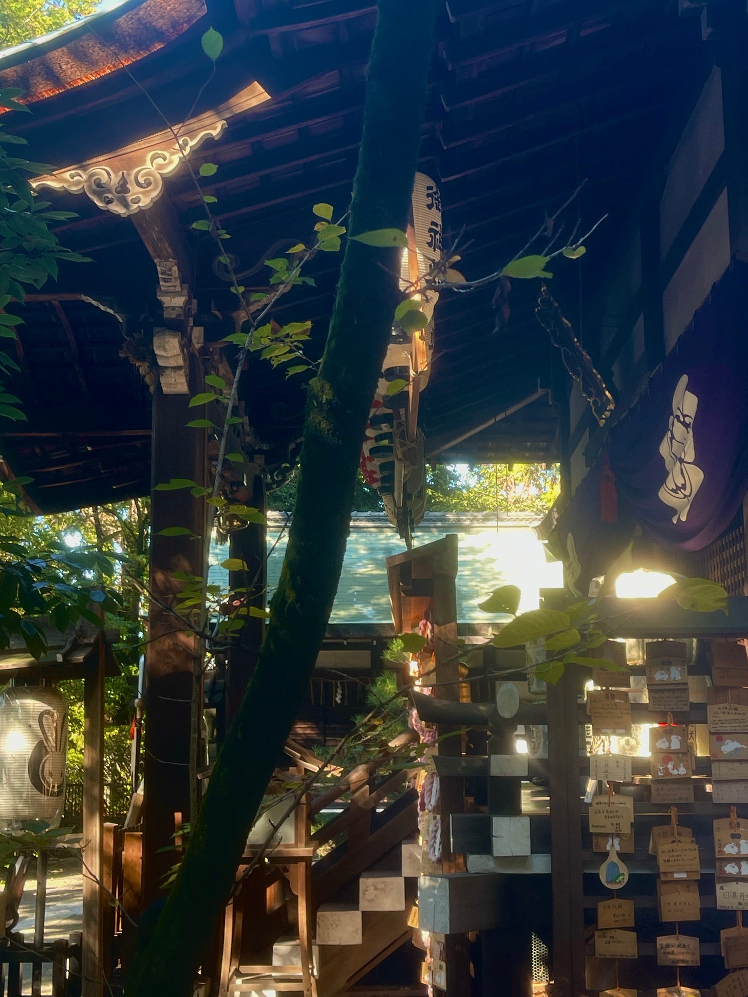 In my recent travels to Japan, I accidentally stumbled upon the Okazaki-jinja shrine in Kyoto. The gate caught my attention on my way to the Philosopher’s Path, and upon entering next to a large tree, one sees the city as through the edge of a forest. There’s a playful kind of serenity that unfolds as rabbit statues are scattered throughout, showing up like hares on a meadow.
